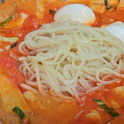 떡, 어묵, 약간의 당근과 양파, 양배추가 들어있고 추가한 쫄면과 라면 사리가 잘 어우러져 있습니다.